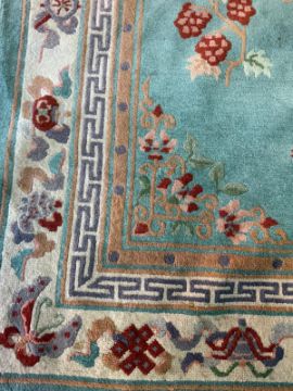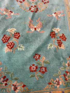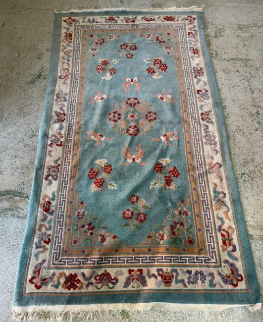 A wool rug, blue grounds with a floral border and central pattern (220cm x 124cm)