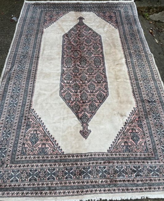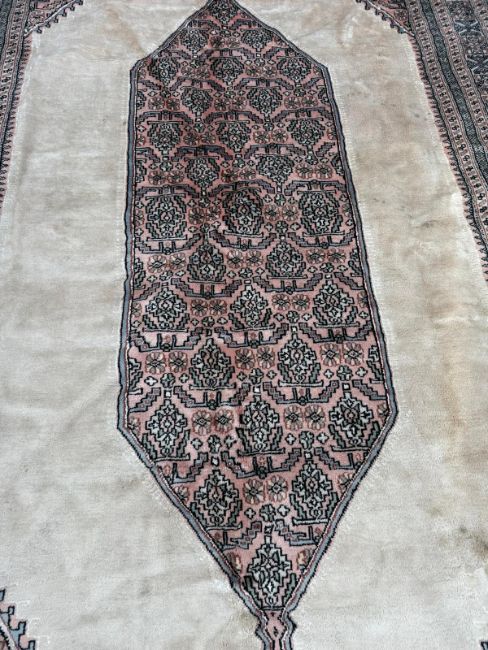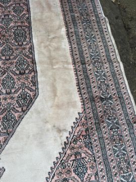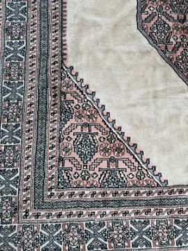 A Bokhara carpet. Beige grounds with a geometric border and central shield (300cm x 200cm)
