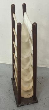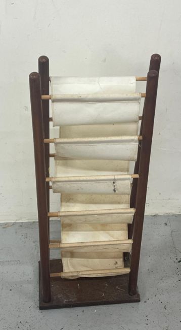 A mid century wood and canvas magazine rack