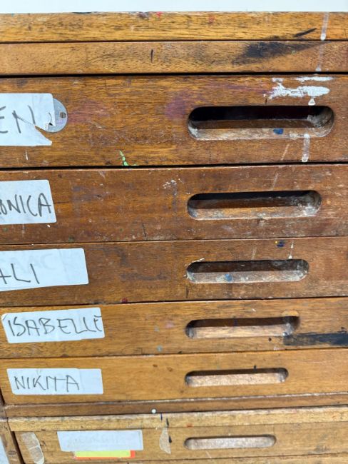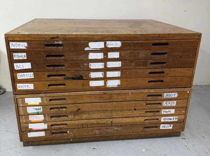 A light oak ten-drawer plan chest (H87cm W127cm D95cm)