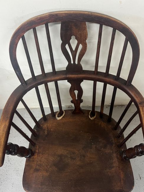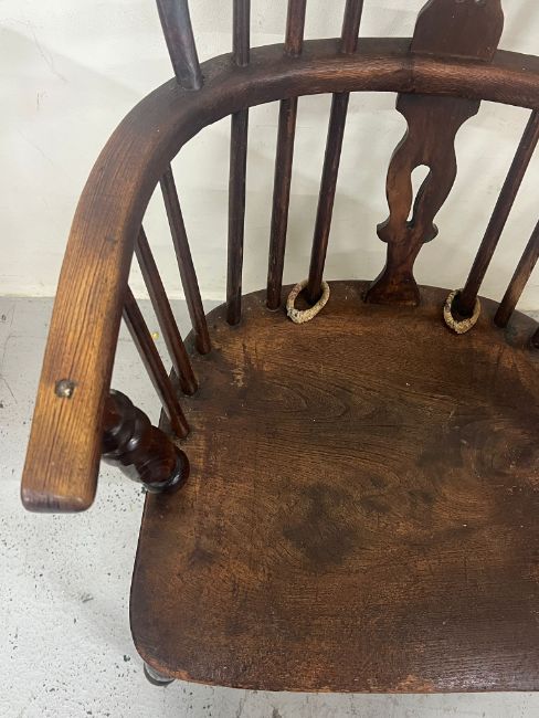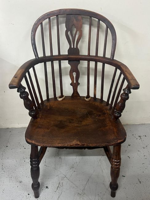 An antique Windsor armchair featuring a low U shaped arm bow with a central pierced back