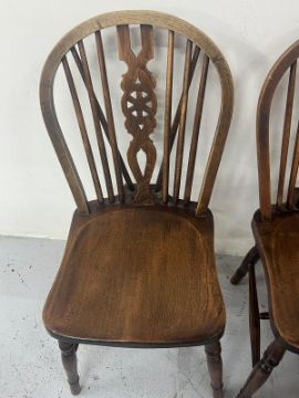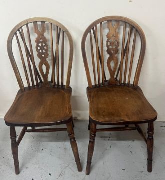 A pair of Windsor style dining chairs with wheel back splat and saddle seat