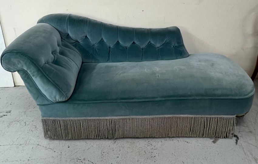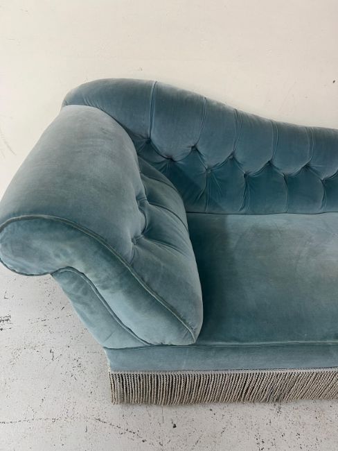 An antique French Napoleon style chaise longue upholstered in light blue (167cm x 70cm x 78cm)