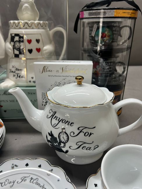A selection of Alice in Wonderland memorabilia to include teapot, saucers and cups