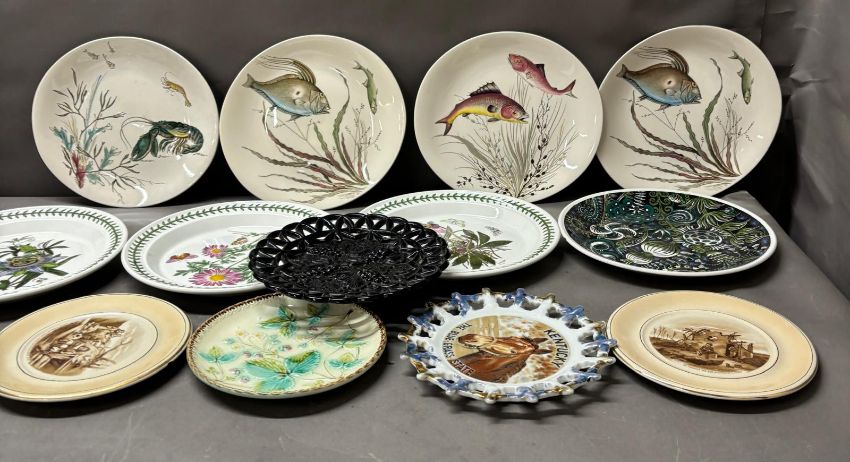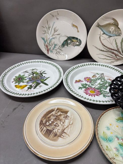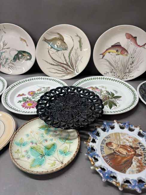 A selection of different plates to include three Portmerion, four Johnsons fish plates and various others