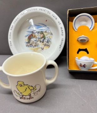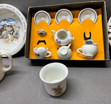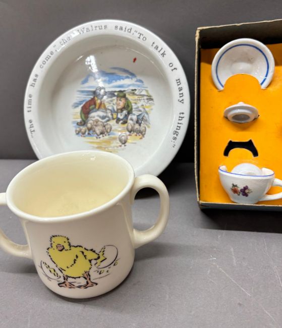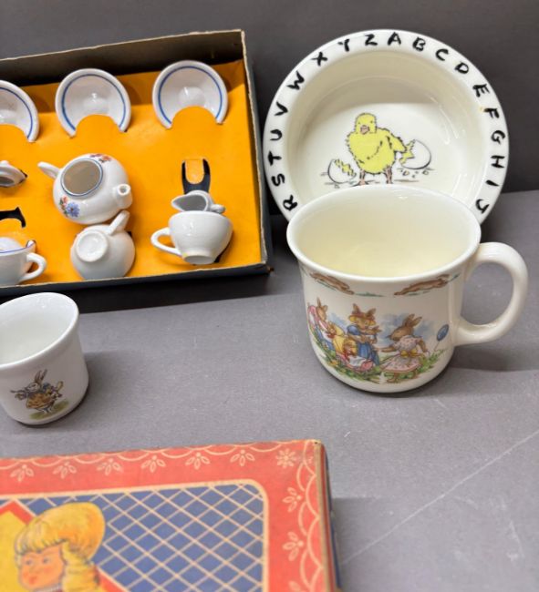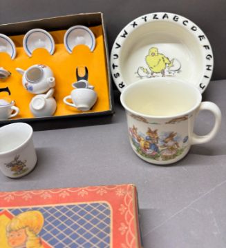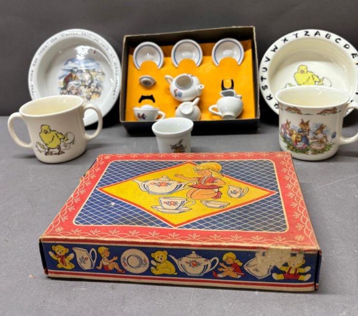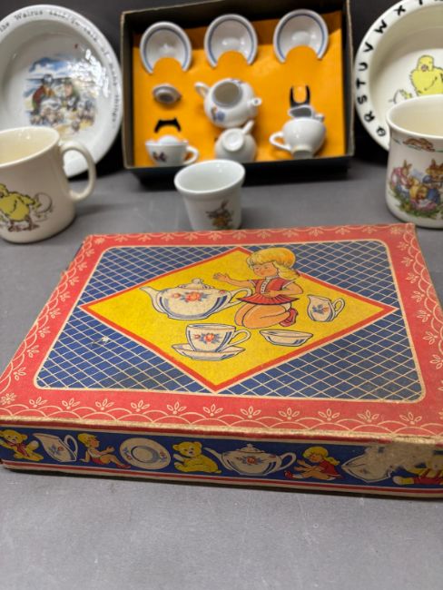 A vintage children's porcelain tea set in its original box with varied kids' dishes and cups